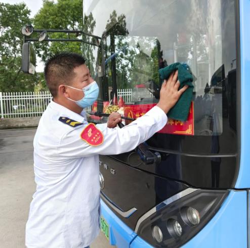 在淮海文博園公交樞紐站內(nèi),81路駕駛員謝新建正在車廂內(nèi)消毒,中午的車場(chǎng)經(jīng)過烈日炙烤,地表溫度有50多度,為了能給乘客提供一個(gè)舒適、安全的乘車環(huán)境,謝新建每班發(fā)車前都會(huì)提前上車檢查車輛設(shè)施設(shè)備、將車廂內(nèi)外打掃干凈,提前打開空調(diào),身上衣服濕了又干、干了又濕······