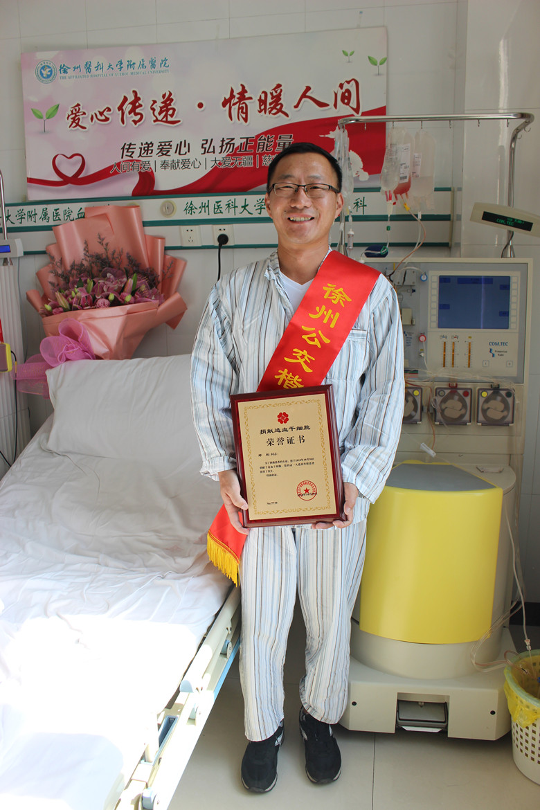 2018年10月30日上午8時(shí)許,徐州醫(yī)科大學(xué)附屬醫(yī)院血液科,37歲的公交小伙兒鄭剛異常平靜地躺在病床上,殷紅的鮮血汩汩從兩只手臂上連接著不停運(yùn)轉(zhuǎn)地造血干細(xì)胞采集機(jī)器的針管間流淌,經(jīng)約3小時(shí)的采集,這份帶著濃濃深情和殷切希望、143毫升的造血干細(xì)胞混懸液,將為一名3歲白血病男孩送去生命的火種。鄭剛也成為徐州公交系統(tǒng)首例、徐州市第77例造血干細(xì)胞的捐獻(xiàn)者。